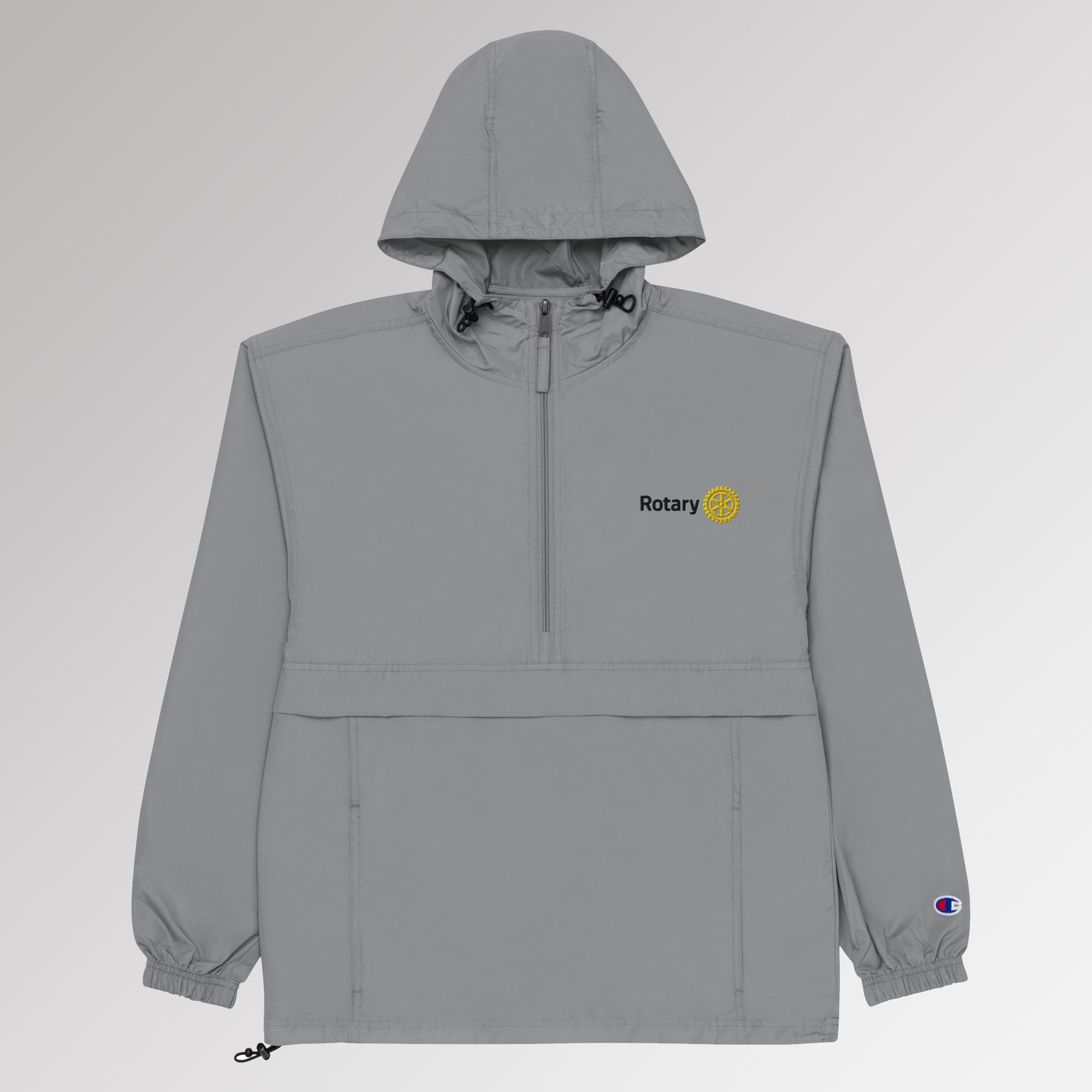 • Design: Half-zip pullover style with a hood, elastic cuffs, and adjustable bungee drawcords at the hood and hem. Embroidered on the chest with the simplified Rotary International Masterbrand logo, plus Champion’s iconic “C” logo on the left sleeve. Easily packs into the hidden zippered pouch pocket.