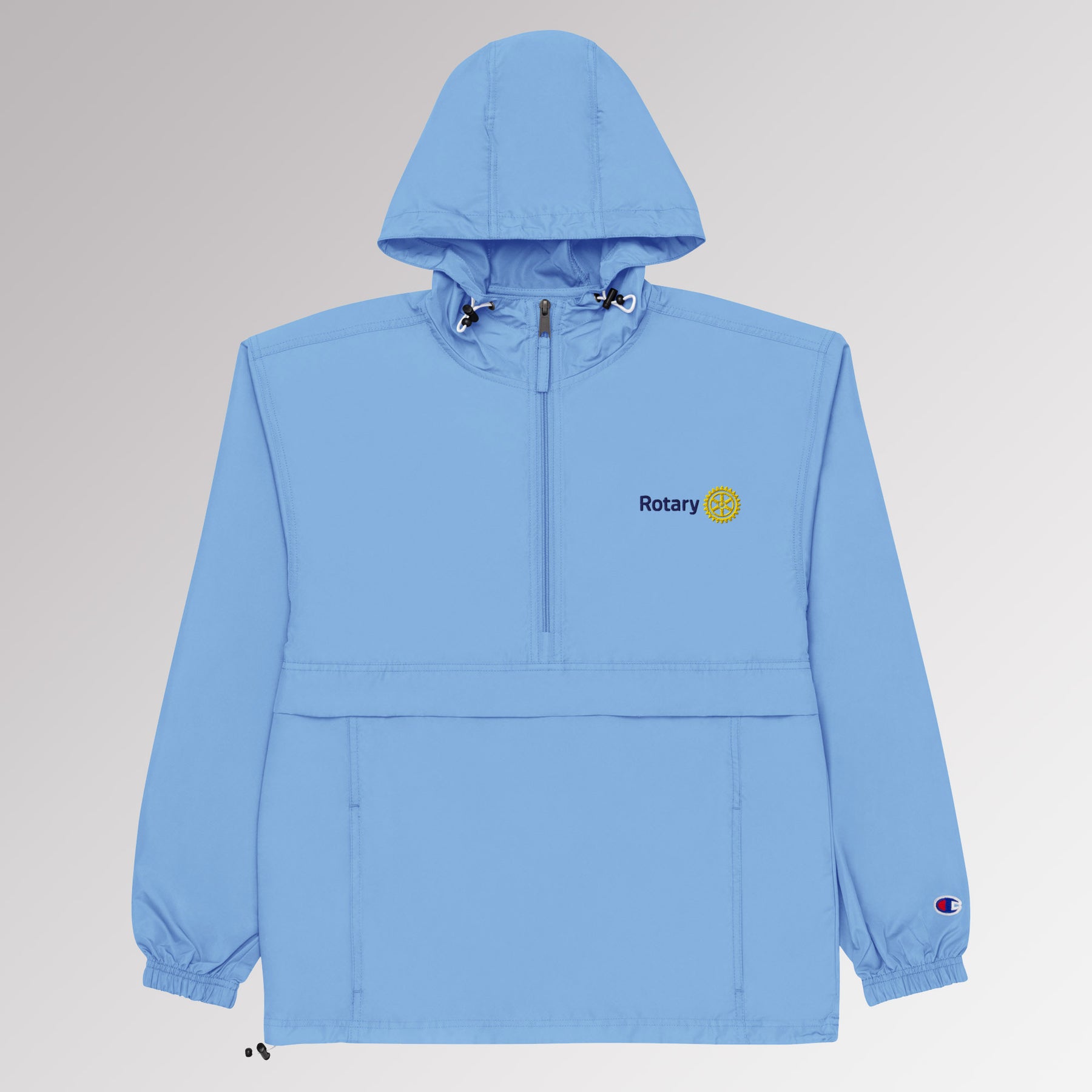 - Design: Half-zip pullover style with a hood, elastic cuffs, and adjustable bungee drawcords at the hood and hem. Embroidered on the chest with the simplified Rotary International Masterbrand logo, plus Champion’s iconic “C” logo on the left sleeve. Easily packs into the hidden zippered pouch pocket.